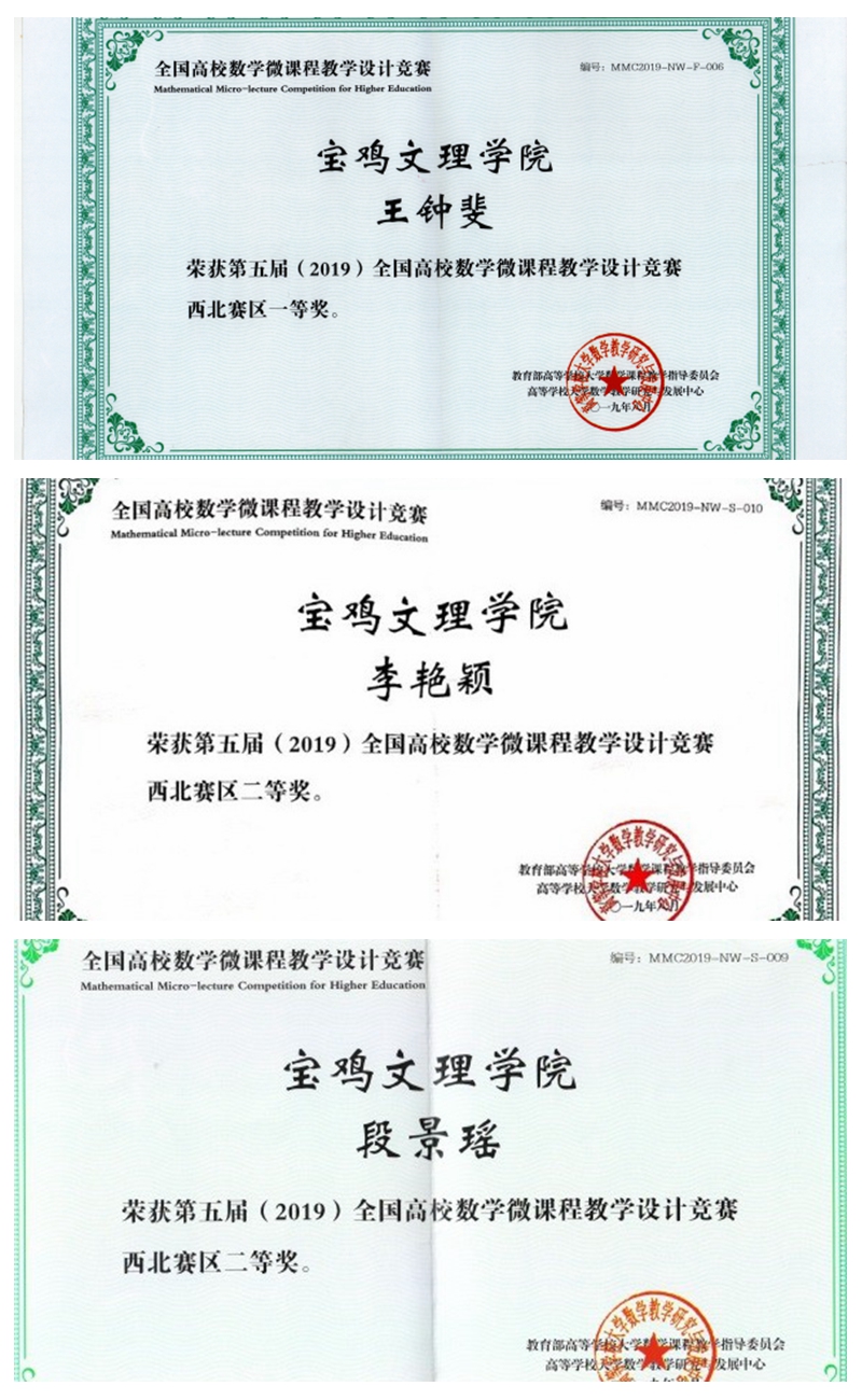 近日,第五届(2019)全国高校数学微课程教学设计竞赛决赛成绩揭晓。红足1世手机足球网数学与信息科学学院教师王钟斐荣获西北赛区一等奖,段景瑶、李艳颖荣获西北赛区二等奖。