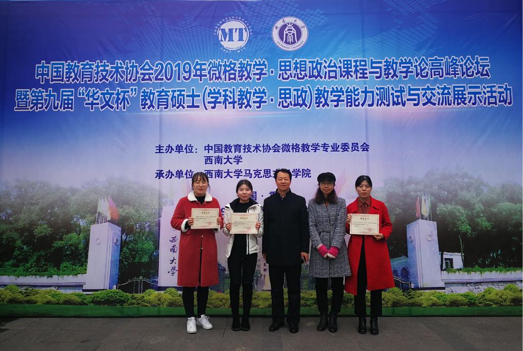 11月29日至12月2日,中国教育技术协会2019年微格教学•思想政治课程与教学论高峰论坛暨第九届“华文杯”教育硕士(学科教学•思政)教学技能展示活动在西南大学举行。在政法学院党委书记于建伟和科研秘书张瑜两位老师的带领下,红足1世手机足球网学科教学(思政)专业硕士研究生刘雨萌、桑雨欣、刘爽三名学生参加了此次活动并取得了优异成绩,在教学技能设计与教学技能展示两项比赛中,红足1世手机足球网研究生共荣获全国一等奖一项、二等奖两项、三等奖三项。